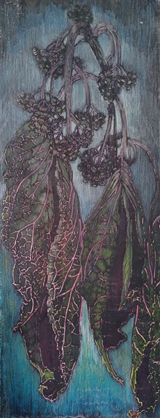 Inspired by an exhibition of Japanese woodblocks and the intricate works of Cressida Campbell and Margaret Preston, I turned to a piece of found timber. Using a Dremel, I carved an impression of a wilted cutting from my own garden, then hand printed and embellished with pencil. This was one of my first woodcuts which then led into the current exploration of Mokulito to Woodcut.