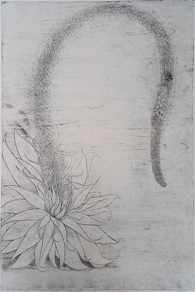 For months I watched this “alien” flower emerge from a giant Agave I had rescued from the nature strip. As I drew, the form took on a life of its own, resembling a swan drifting through watery reflections. These pieces illustrate the shift in aesthetic that I find fascinating to work with. I deliberately surrender the drawing to the ink to allow the print to morph from a soft Mokulito print to a decisive woodcut using the same plate.
