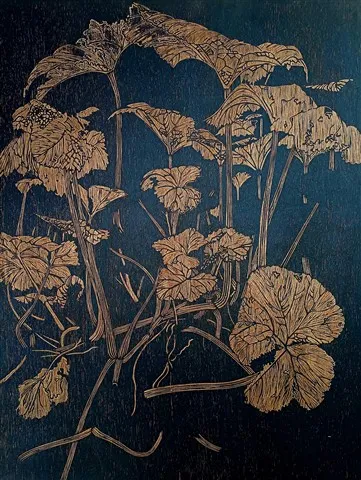 Whilst drawing my humble backyard pumpkin patch, I saw in the leaves the graceful, architectural lines of Art Nouveau. Capturing this tiny patch of garden resulted in a very complex drawing which printed as a Mokulito ultimately surrendered to the woodcut print. The board itself, holding the history of the process, remains my favorite outcome of the series.