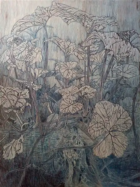 Whilst drawing my humble backyard pumpkin patch, I saw in them the graceful, architectural lines of Art Nouveau. Capturing this tiny patch of garden resulted in a very complex drawing which printed as a Mokulito ultimately then surrendered to the woodcut print. This is a Giclee print on archival paper of that original drawing. Available to purchase unframed.